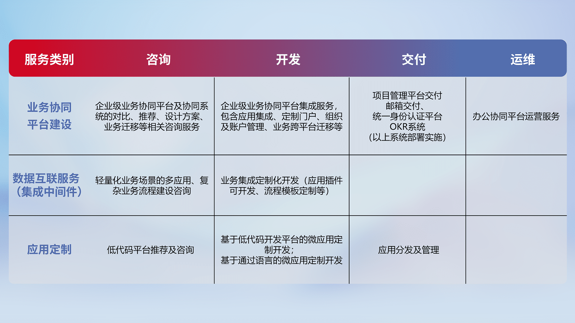 针对钉钉、、、企微、、IDaas等平台级产品提供产品的规划、、、、方案、、、、交付、、、、定制化开发等服务,,,,实现如统一协同办公、、、智能客户服务、、、混合会议管理、、、智能数据查询、、、等业务场景,,,实现数字化转型。。。。