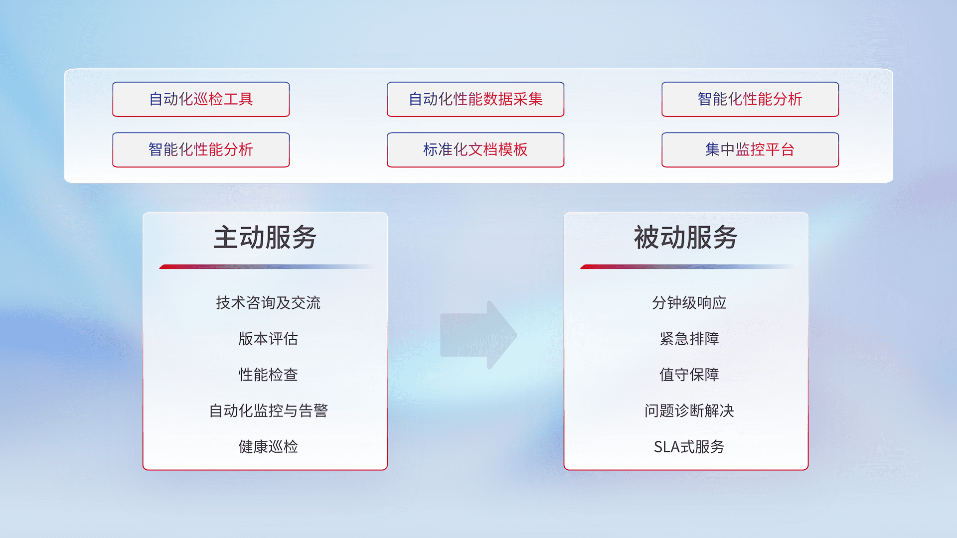 智能化工具和标准化文档,,保障服务质量,,,提供主动服务(包含技术咨询、、、版本评估、、、、性能检查、、、自动化监控与告警、、、健康巡检)和被动服务包含(分钟级响应、、、、紧急排障、、、值守保障、、、、问题诊断解决、、SLA服务)。。